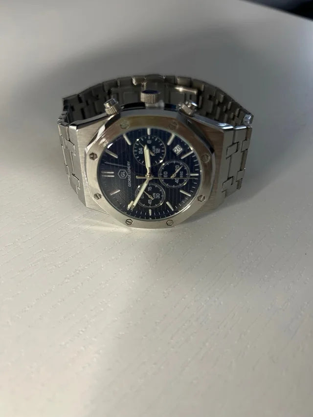 Este reloj George Luxury combina elegancia y sofisticación con su esfera negra y acabado plateado en caja y correa, creando un diseño atemporal que realza cualquier estilo. Perfecto para quienes buscan un accesorio refinado que resalte en cualquier ocasión.